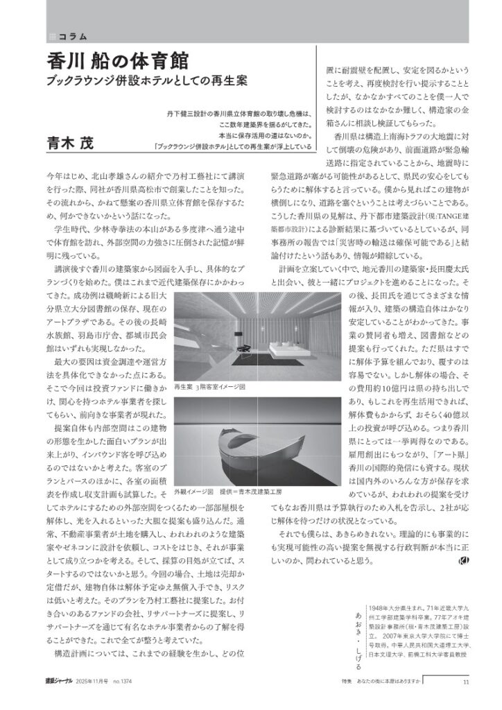 『建築ジャーナル』2025年11月号(2025年11月1日発行)「あなたの街に本屋はありますか」に、青木茂が執筆した記事「香川船の体育館-ブックラウンジ併設ホテルとしての再生案」が掲載されました。ぜひご覧ください。