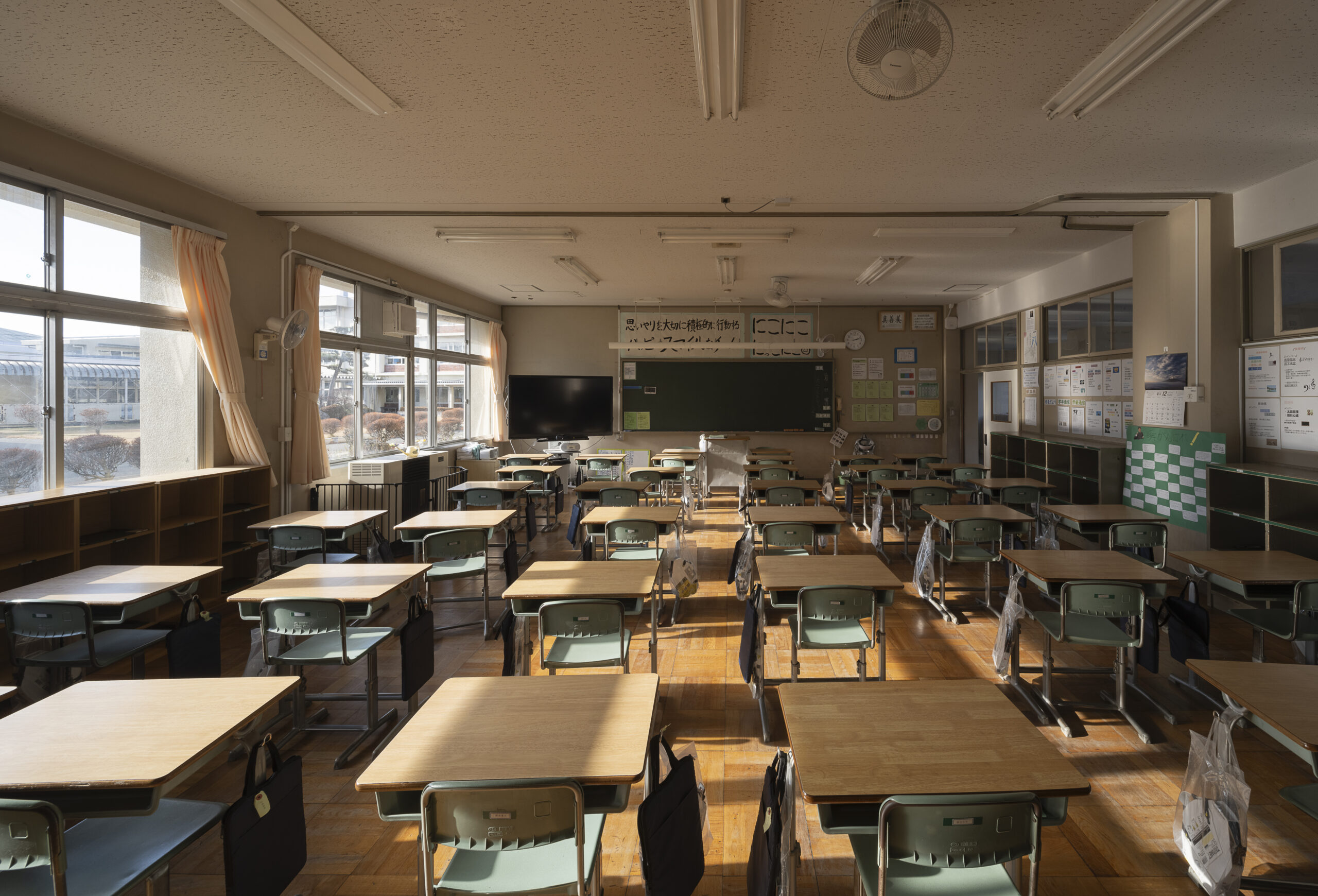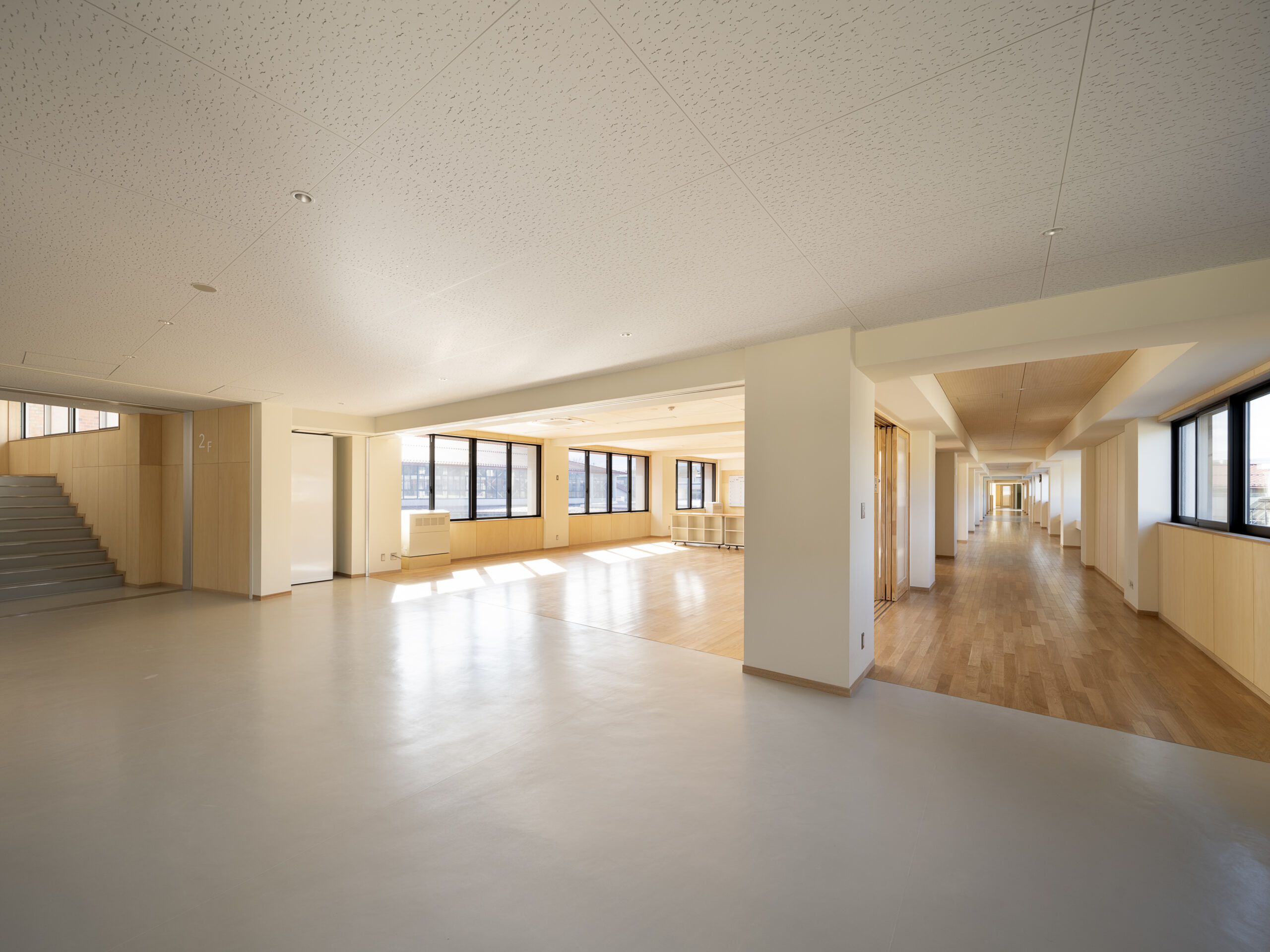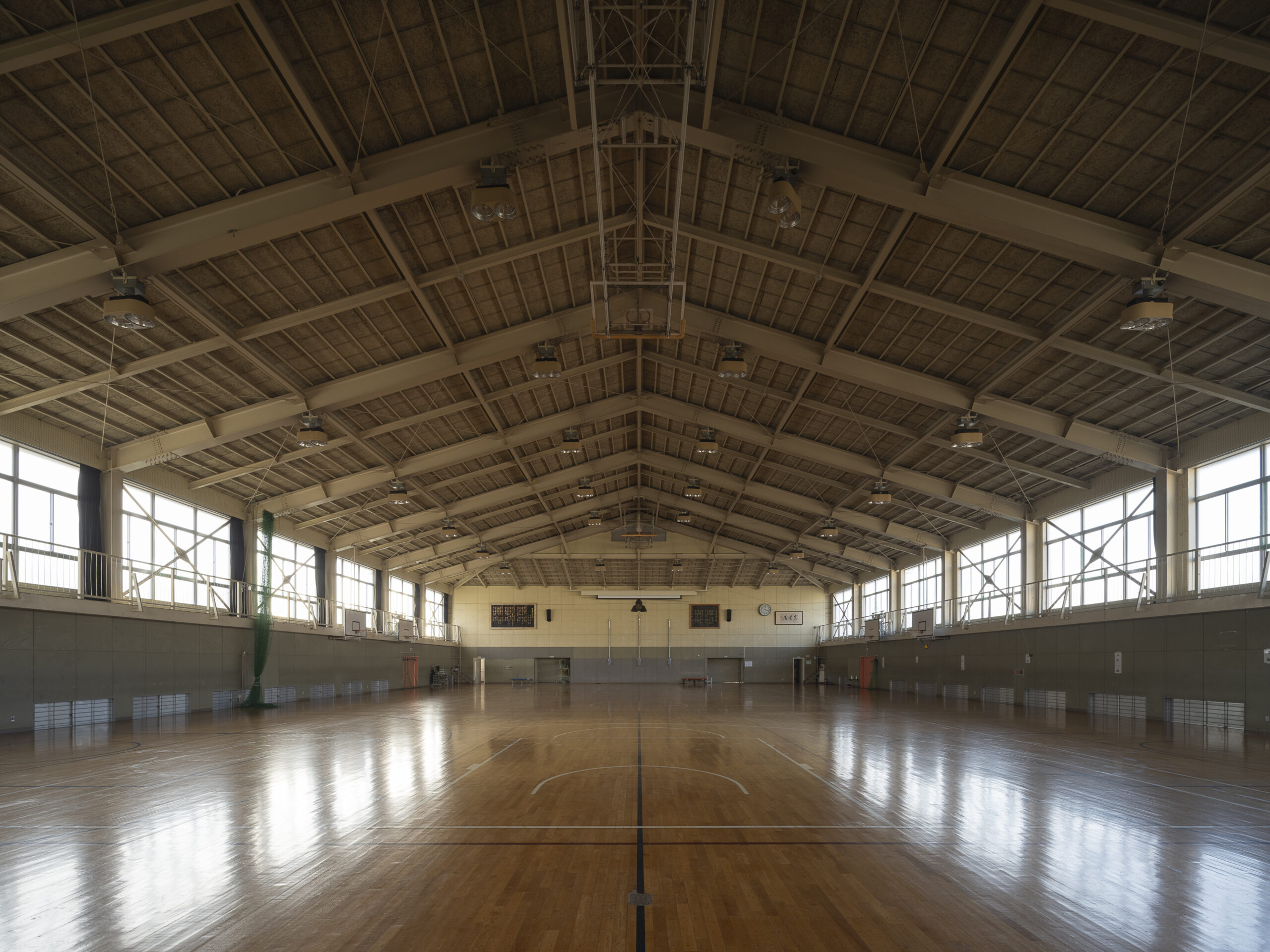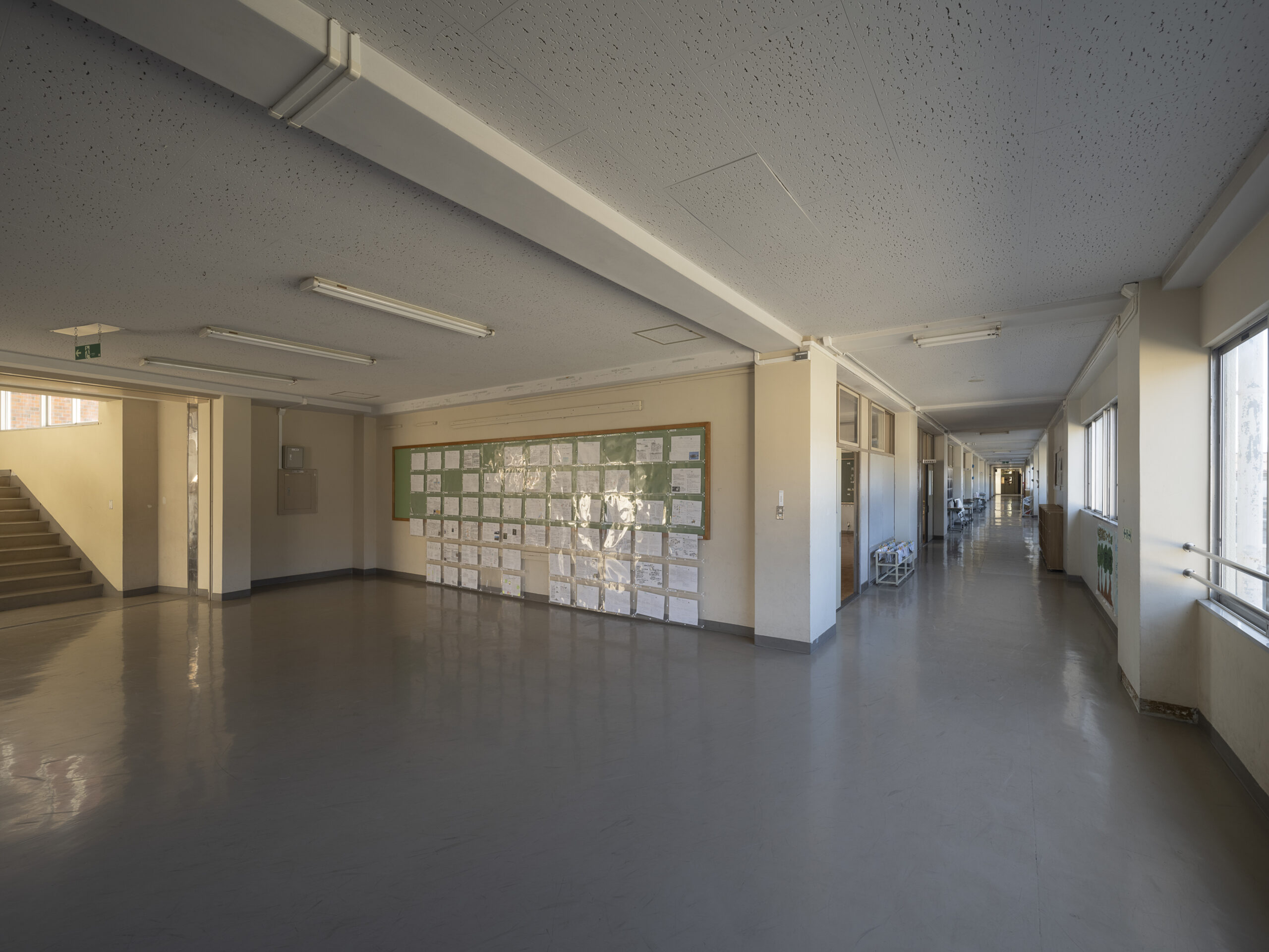 富士山の裾野に位置するこの中学校からは、日常の中で常に富士山を望むことができる。その圧倒的な存在は、地域における空間の中心であり、同時に人々の認識を方向づける基準点でもある。本計画では、この「中心を共有する空間構造」を学校に取り込むことを試みた。校内の中心に広場を据え、それを全ての校舎をつなぐ結節点として位置付ける。さらに、その周囲を円環状の動線で結ぶことで、富士山を中心に裾野が広がるような構成を空間化した。円形の渡り廊下は、各棟を機能的に接続するだけでなく、学校全体を一体の場として認識させる装置となる。また旧技術室棟と校舎棟の間にそれらをつなぐ鉄骨平屋建ての建物を増築し、大きなメディアセンターを設けた。