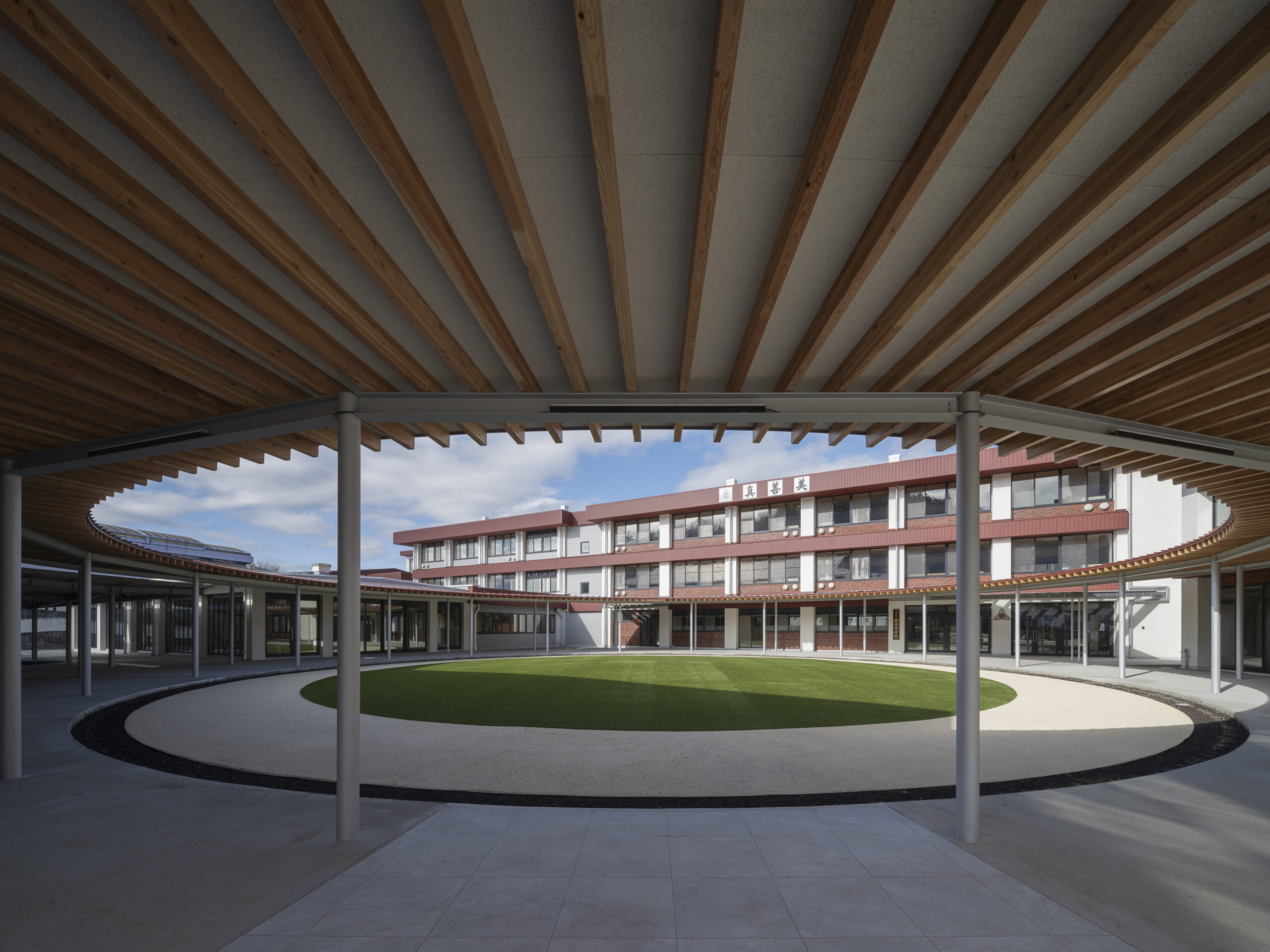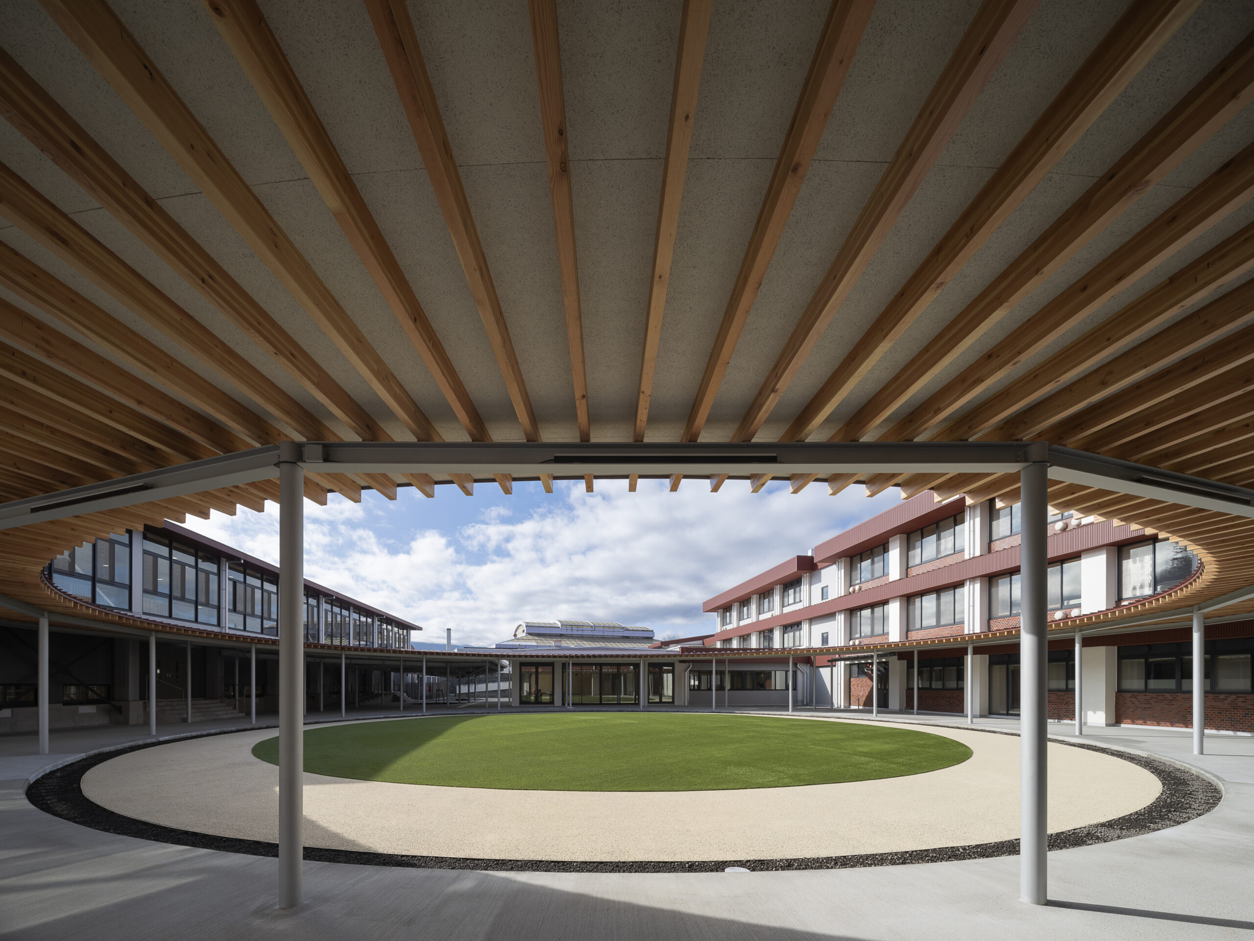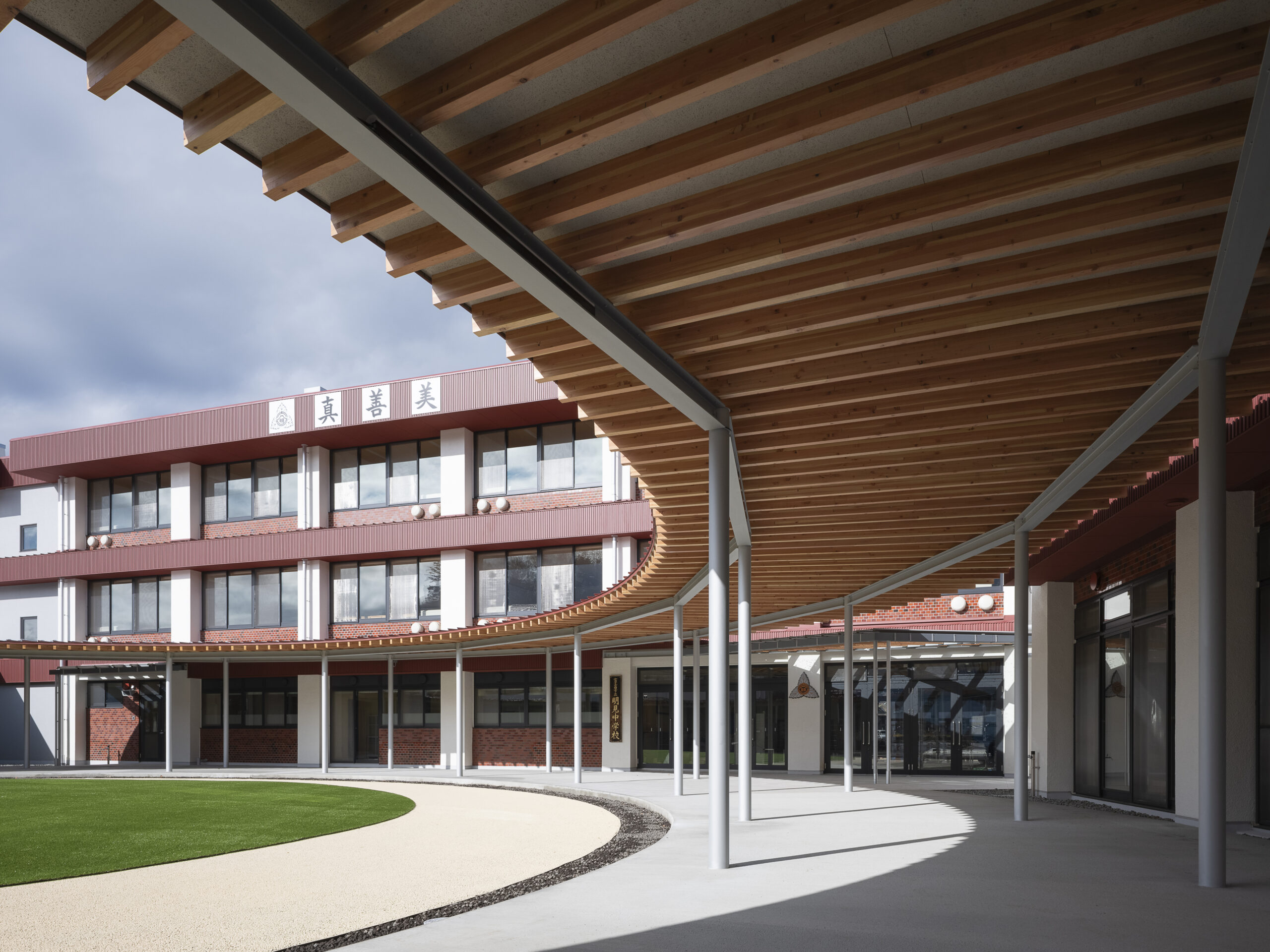 既存校舎にも渡り廊下はあったが、一部つながっていない箇所があり、雨天時において不便であった。円形の渡り廊下はそれを解消するだけでなく、この学校の中心をつくりだし、バラバラであったそれぞれの棟を一つにまとめる役割を持つ。様々な空間に接合された中庭を生徒たちは自由に横切って使うことができ、伸び伸びとあちこちの空間を使うことができる。また、富士吉田市の街の特徴である赤い金属屋根と既存の外壁タイルを活用し、富士山+赤い屋根+タイルで明見中学校ならではの風景をつくることで、 生徒・教員・卒業生そして地域に愛される学校であり続けることを目指した。