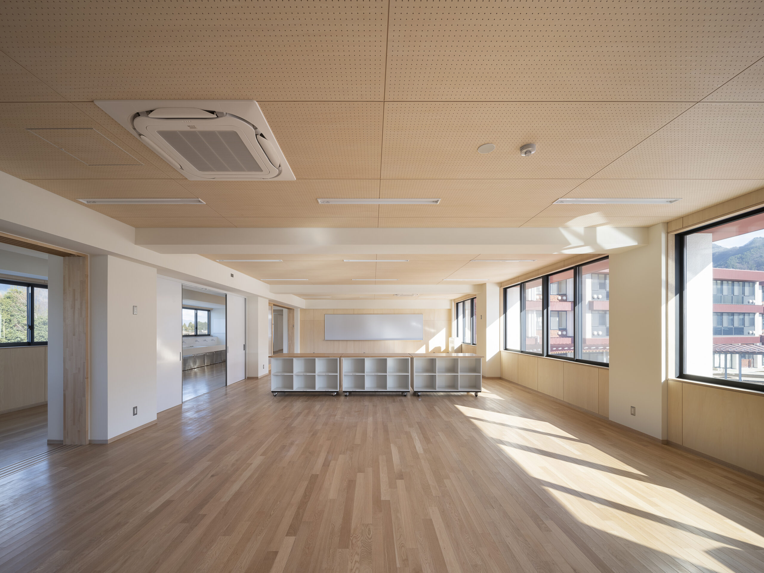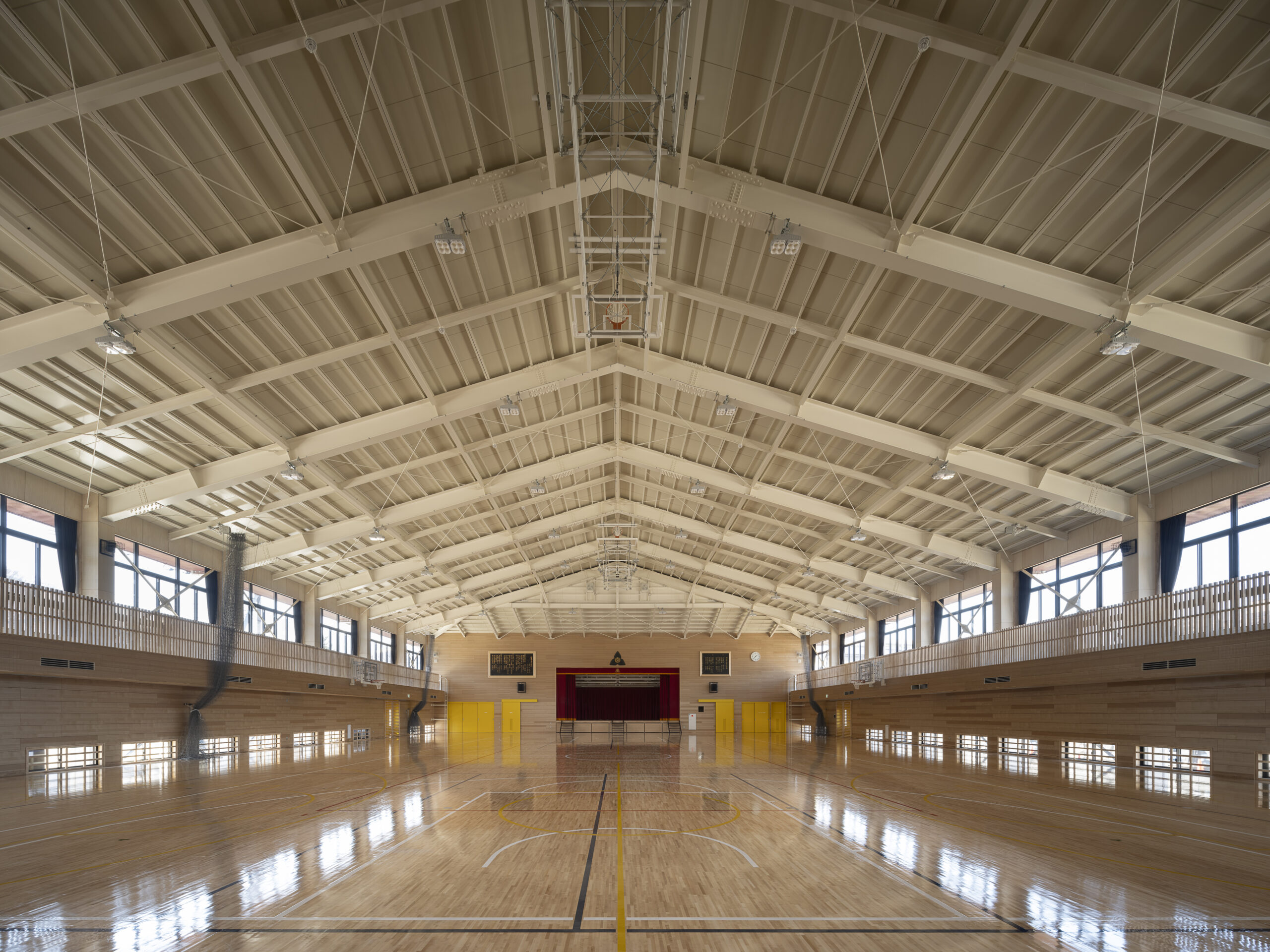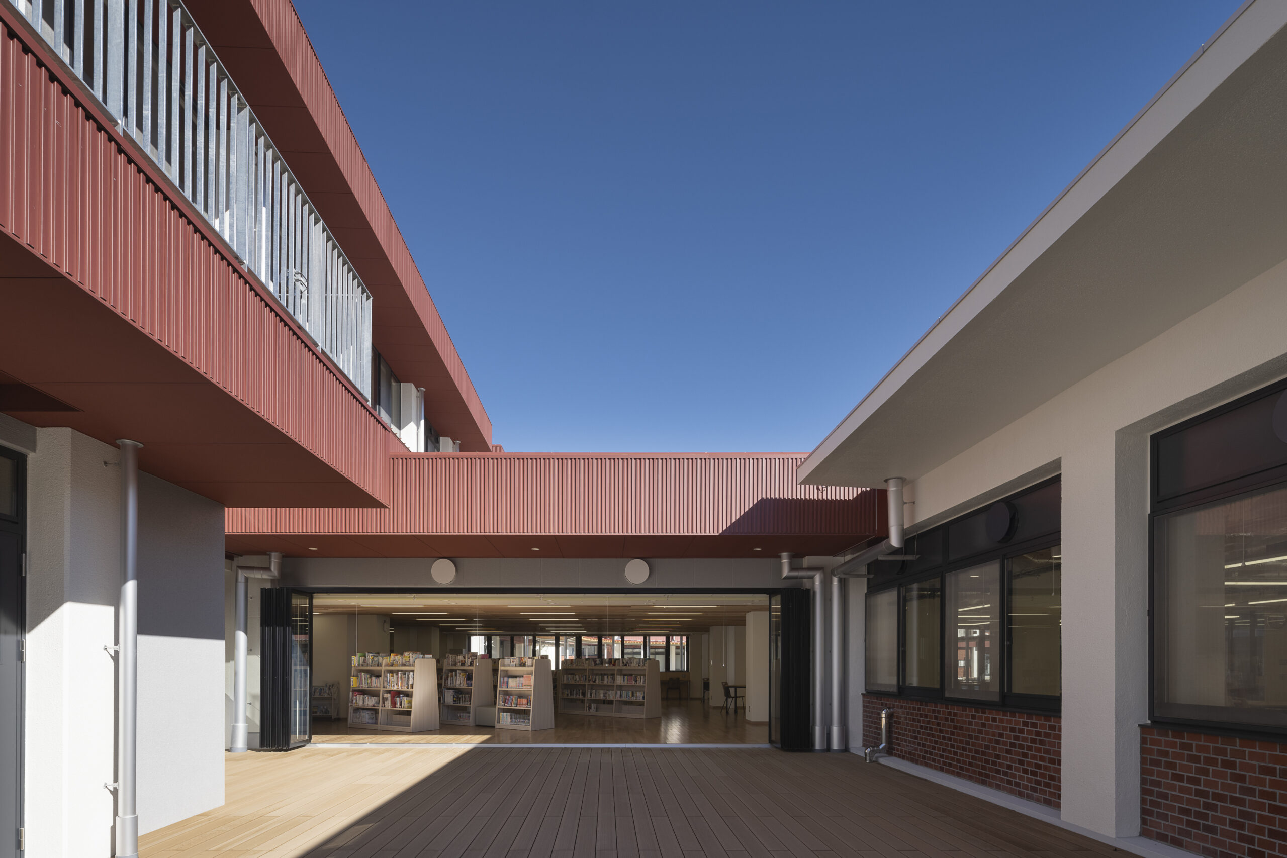 既存校舎にも渡り廊下はあったが、一部つながっていない箇所があり、雨天時において不便であった。円形の渡り廊下はそれを解消するだけでなく、この学校の中心をつくりだし、バラバラであったそれぞれの棟を一つにまとめる役割を持つ。様々な空間に接合された中庭を生徒たちは自由に横切って使うことができ、伸び伸びとあちこちの空間を使うことができる。また、富士吉田市の街の特徴である赤い金属屋根と既存の外壁タイルを活用し、富士山+赤い屋根+タイルで明見中学校ならではの風景をつくることで、 生徒・教員・卒業生そして地域に愛される学校であり続けることを目指した。